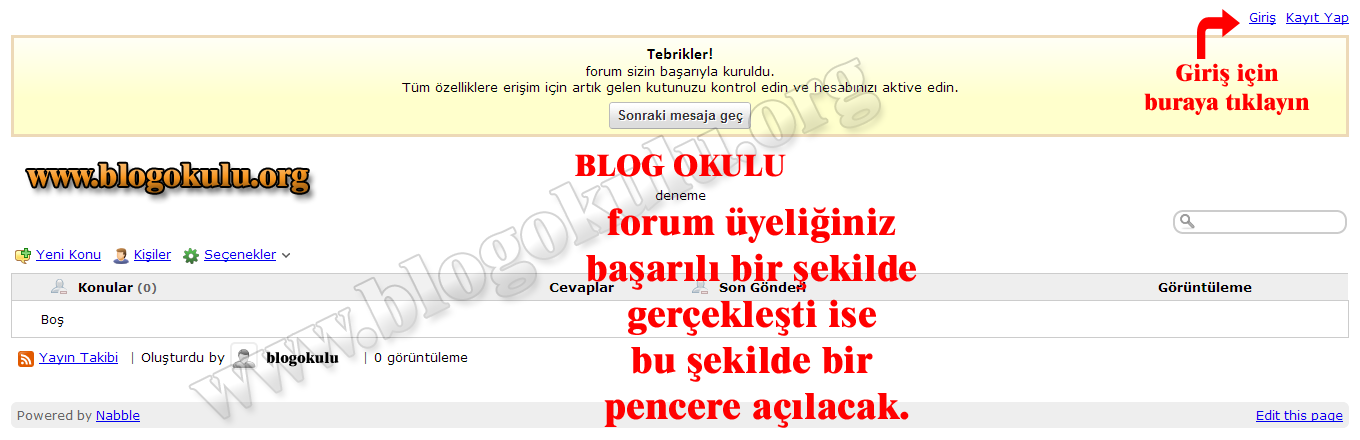 Gördüğünüz gibi forum sayfanız artık blogunuzun içinde çıkıyor.Forum sayfanıza Ana Sayfadan Link vermeyi unutmayın Menülerin içine Forum diye yeni bir menü ekleyin ki ziyarteçileirniz Blogunuzda bir Forum sayfası olduğunu anlasınlar yada forum sayfanızı bulabilsinler.